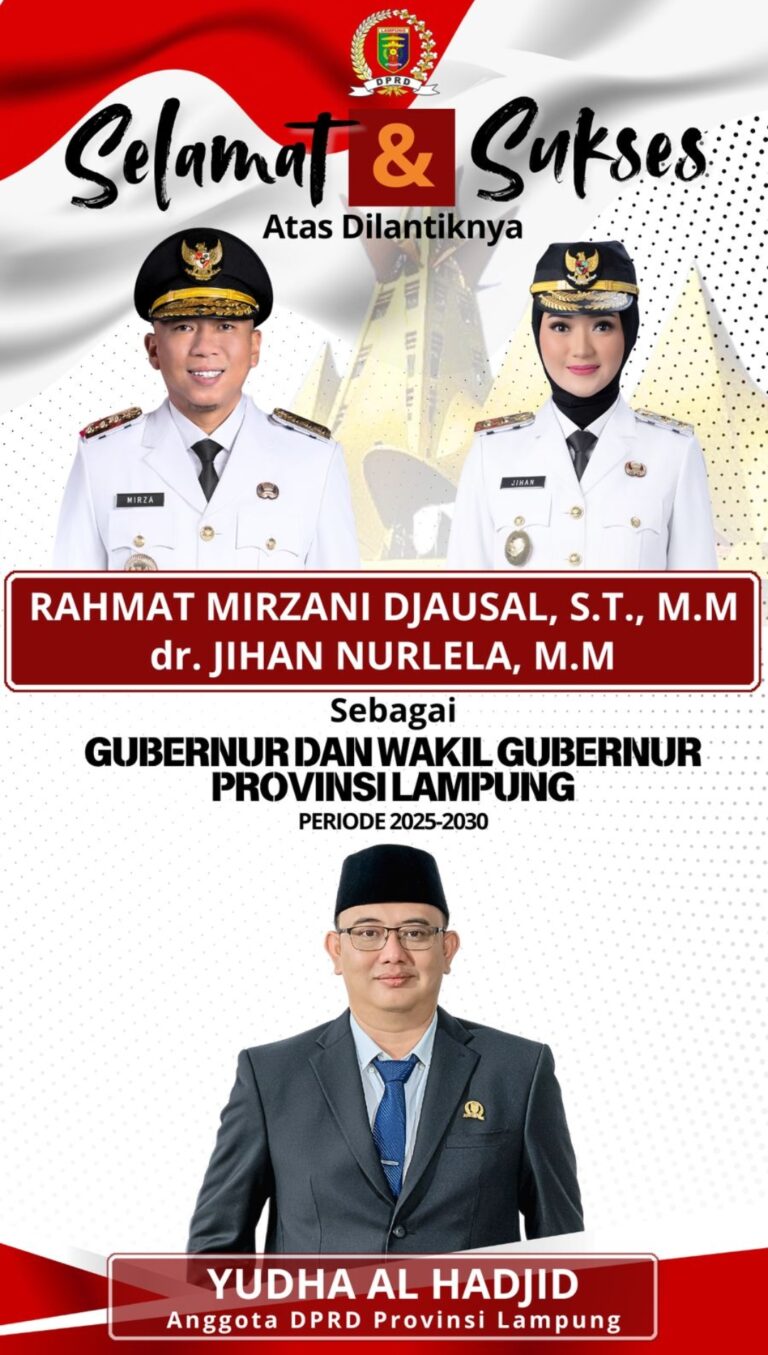 Lampung – Anggota Komisi III DPRD Provinsi Lampung, Yudha Alhadjid ucapkan selamat atas dilantiknya, Gubernur – Wakil Gubernur Lampung Periode 2025 – 2030, Rahmat Mirzani Djausal – Jihan Nurlela. Hal itu sampaikan, usai menghadiri serah Terima jabatan di Jakarta. Kamis (20/02/2025).