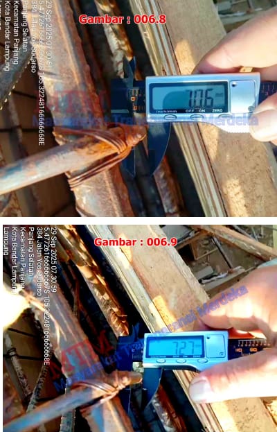 6. PEKERJAAN PASANGAN TULANGAN KOLOM, Indikasi dugaan pelangaran objeknya adalah pada tulangan kolom telah menggunakan besi banci D 18,06 mm / D 18,23 mm, yang semestinya Tulangan utama kolom menggunakan besi D 19 mm,